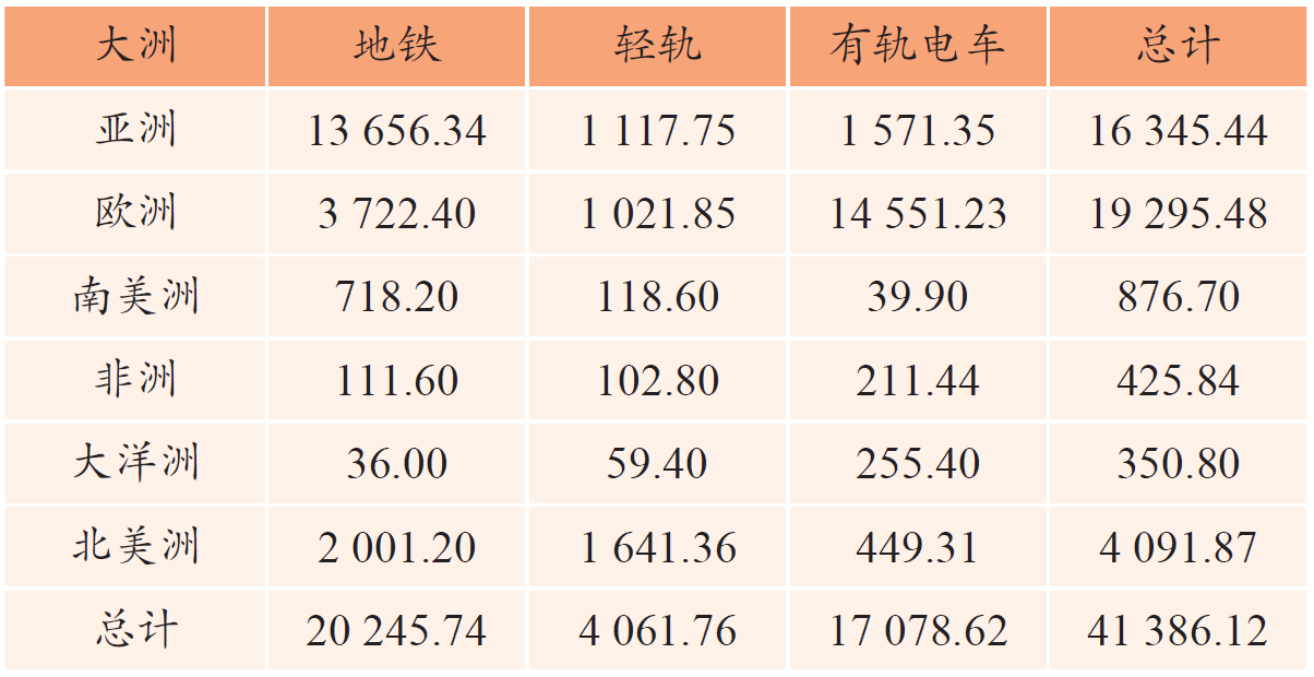 1-rasmda dunyodagi temir yo'l transporti dunyo bo'ylab tranzitining umumiy miqyosi ko'rsatilgan (Eslatma: Rossiyadagi barcha shaharlar Evropaga hisoblash uchun Evropaga tasniflanadi). Ma'lumotlar shuni ko'rsatadiki, metrajli temir yo'llar va tramvaylar global tranzitining asosiy turlari va global temir temir tranziti asosan Osiyo mamlakatlarida taqsimlanadi.