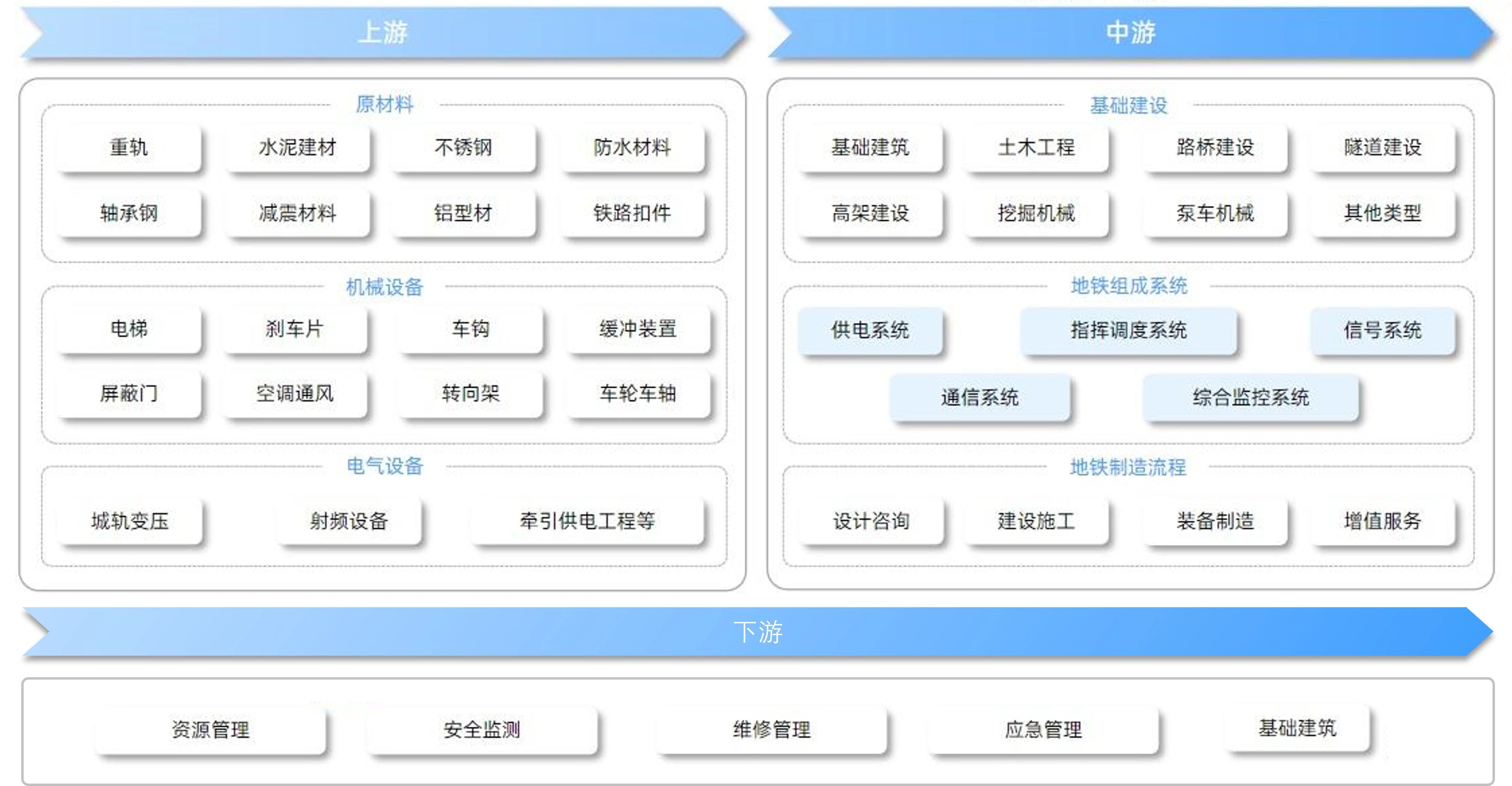 Temir yo'l tranziti shahar sanoatini bog'laydi, sanoat zanjirini kengaytirishga yordam beradi va uskunalarni ishlab chiqarish va texnologik ilmiy-tadqiqot va texnologik ilmiy-r & D kabi qo'llab-quvvatlovchi tarmoqlarning jadal rivojlanishiga olib keladi. Metro sanoatining zanjiri 3-rasmda keltirilgan, bu erda barcha havolalar shahar aglomeratsiyalari va poydevor sohalarining iqtisodiy rivojlanishiga bog'liq. [2]
