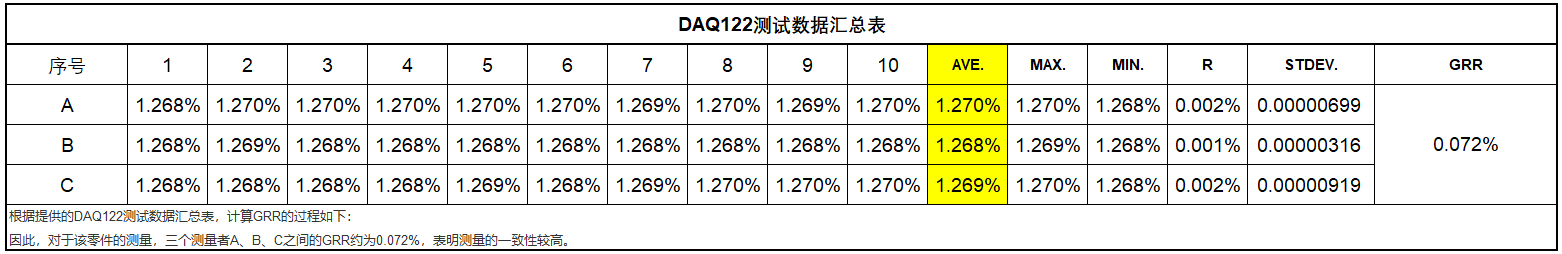 Tanlangan ma'lumotlarni yig'ish kartasi talablarga javob berishini ta'minlash uchun ME jamoasi uni sinab ko'rdi. Tahlil shuni ko'rsatadiki, tanlangan ma'lumotlarni yig'ish kartasi mukammal barqarorlikka ega, A, B va C uchta o'lchovchi orasida GRR taxminan 0,072% ni tashkil qiladi.